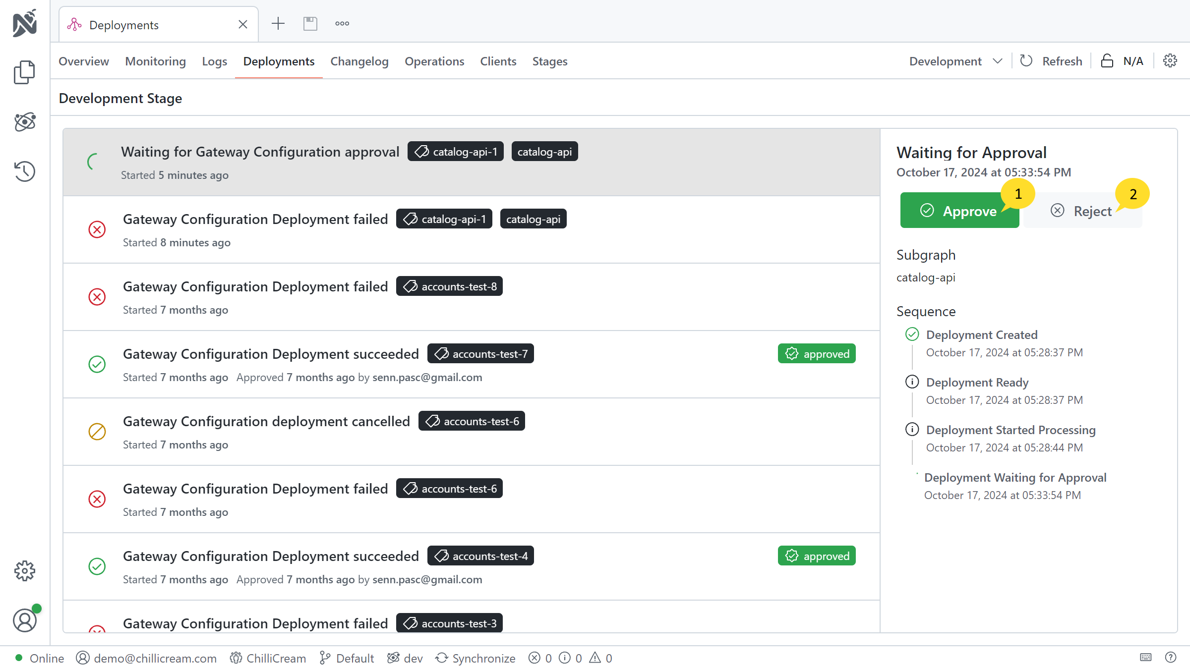 In development environments, it's not uncommon for GraphQL changes to introduce breaking changes. To mitigate the risk of manually pushing such changes to a stage, Nitro CLI offers the --wait-for-approval flag. This option can be utilized when publishing a schema, client, or fusion configuration and serves as a time saver by allowing you to review and approve deployments directly from the "Deployments" tab.