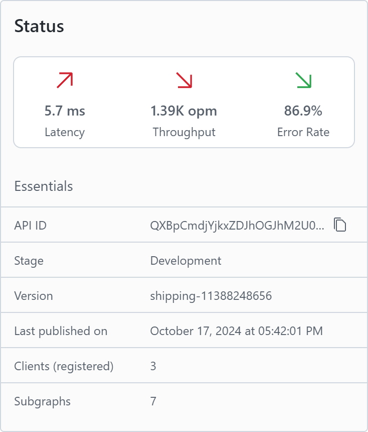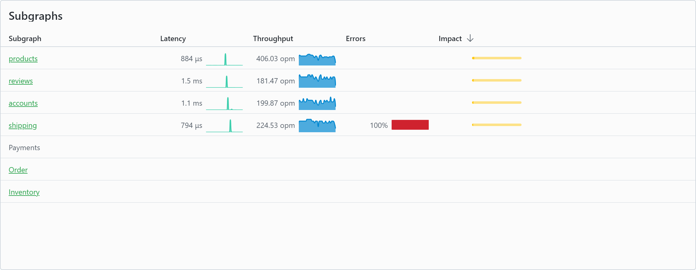 The subgraphs view shows you a quick overview over your connected subgraphs. You can see the latency, throughput and error rate of each subgraph.