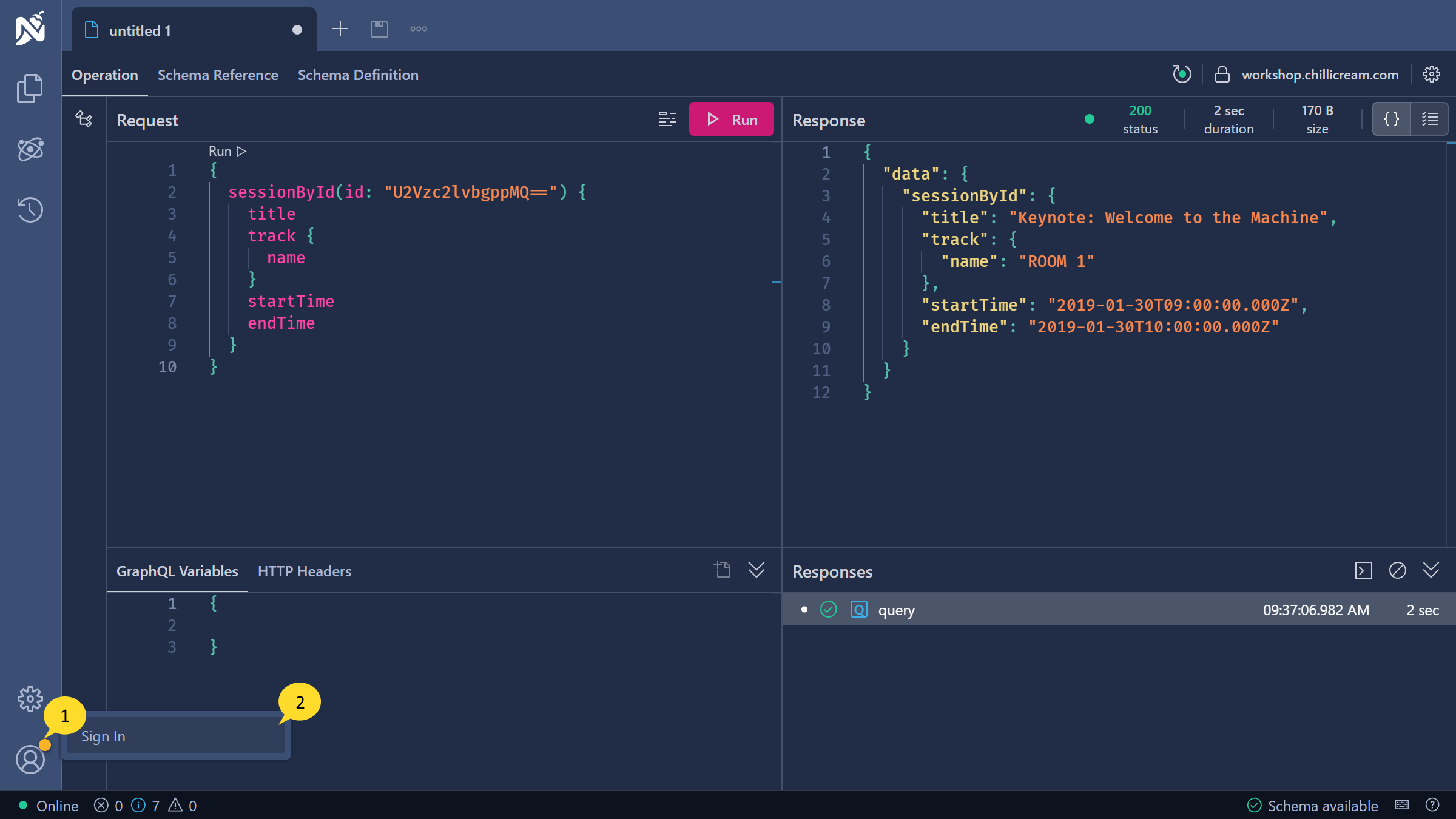 Step 7: Click on the 'Run' button. You should see a response with data in the 'Response' area. Congratulations, you have completed a GraphQL query!