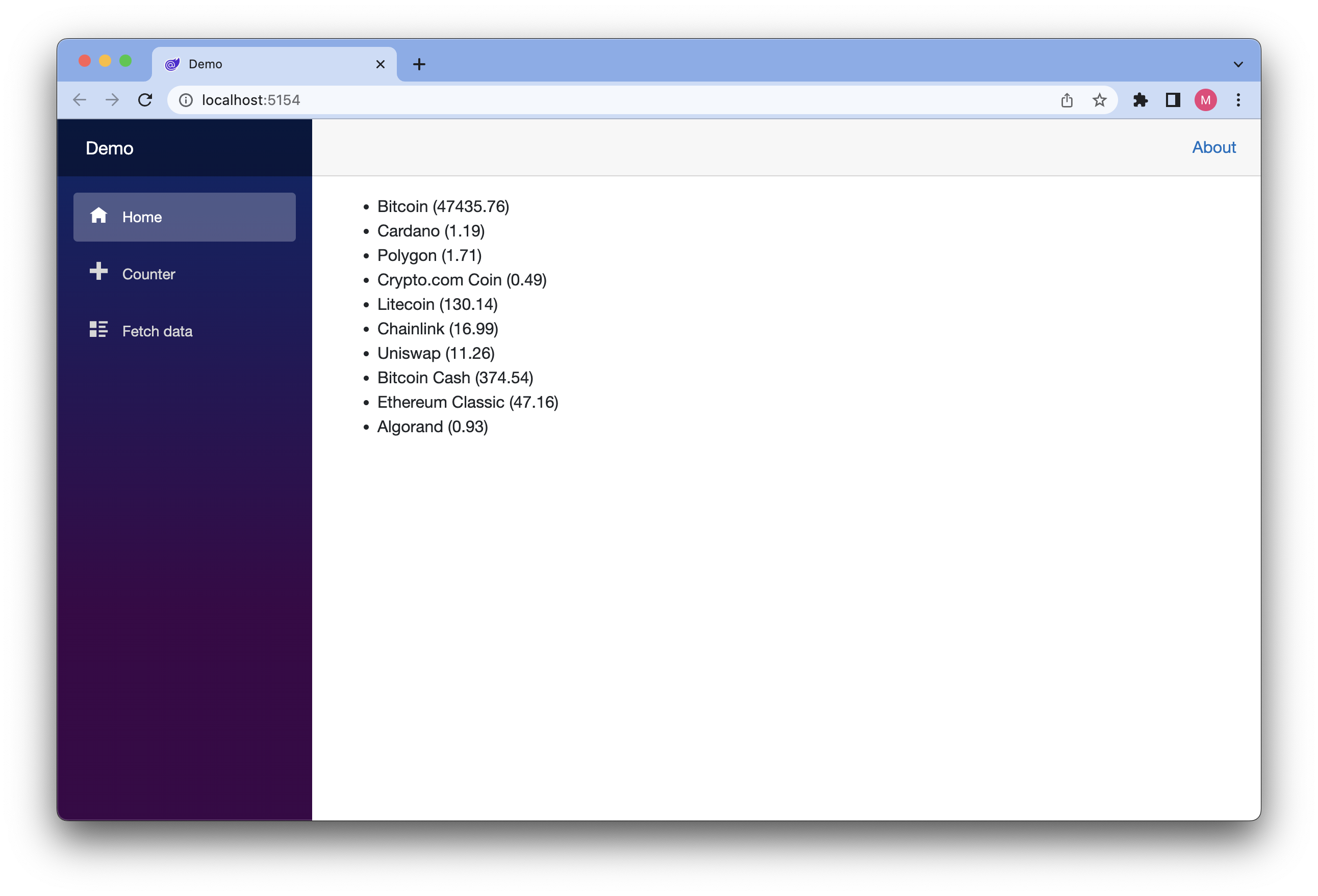 In this section we will integrate the Razor component and print a simple list on our index page to display the crypto currencies.