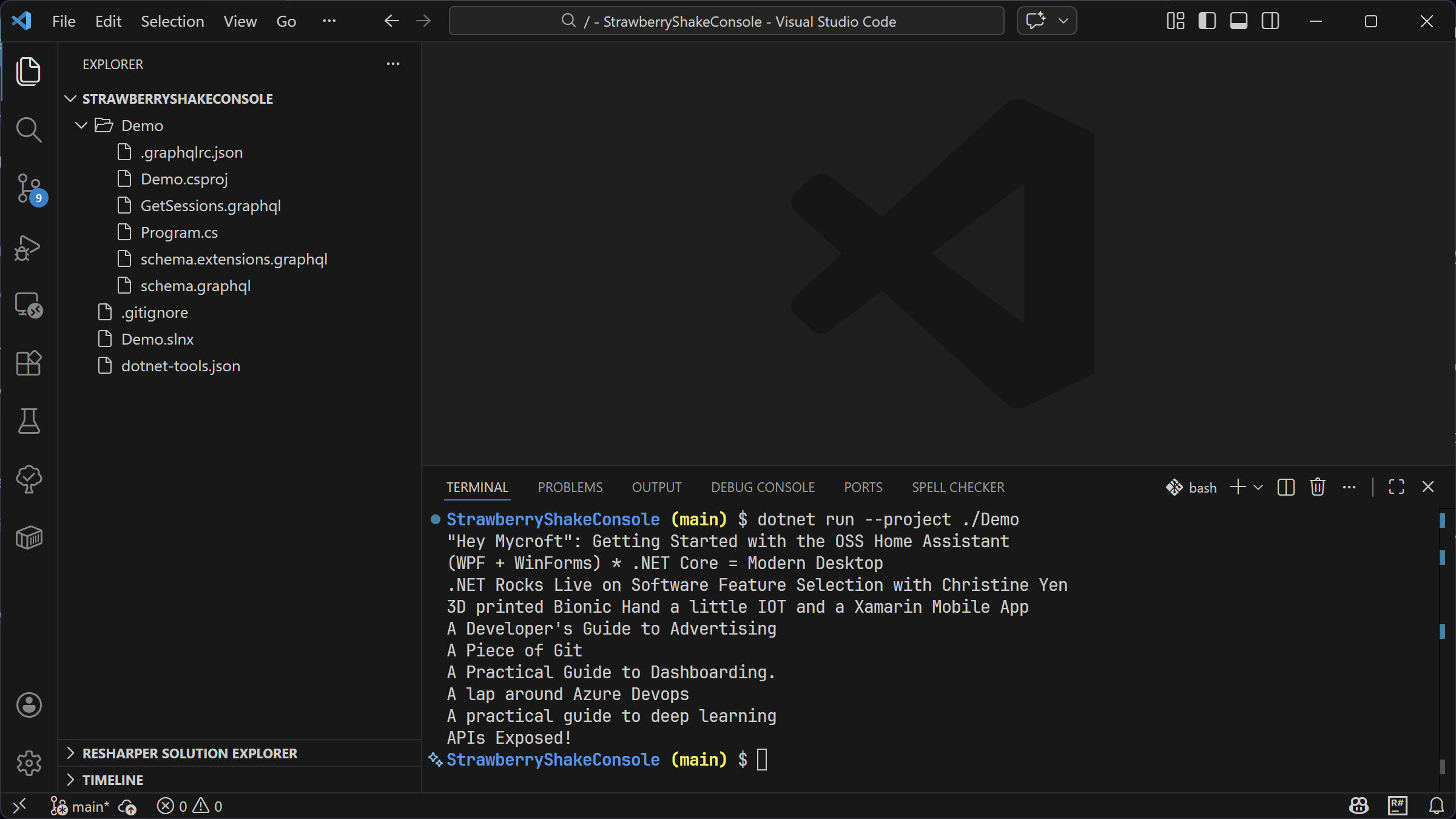 dotnet graphql init https://workshop.chillicream.com/graphql/ --clientName ConferenceClient --Path ./Demo